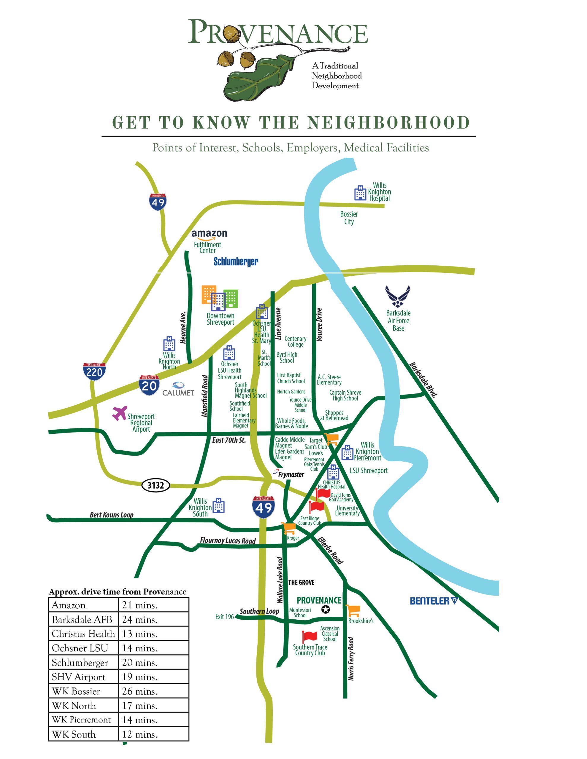 Convenient to I-49 and just 10 minutes from downtown Shreveport, Provenance is located minutes by vehicle from shopping, dining, golf, and South Shreveport’s best amenities.