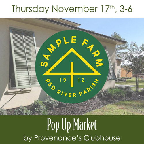 Provenance Clubhouse 1955 Woodberry Avenue, Shreveport, LA, United StatesEach Thursday from 3-6 pm, we will host one local merchant by the Provenance Clubhouse on Woodberry Avenue! Facebook Event Page Nov. 17 Sample Farms Dec. 1 Five Acre Farm Flowers Dec. 8 Nana and Papas Dec. 15 Clean Slate Botanicals Dec. 22 Rosepointe Fare