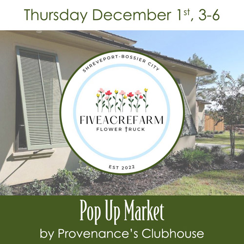 Provenance Clubhouse 1955 Woodberry Avenue, Shreveport, LA, United StatesEach Thursday from 3-6 pm, we will host one local merchant by the Provenance Clubhouse on Woodberry Avenue! Facebook Event Page Dec. 1 Five Acre Farm Flowers Dec. 8 Nana and Papas Dec. 15 Clean Slate Botanicals Dec. 22 Rosepointe Fare
